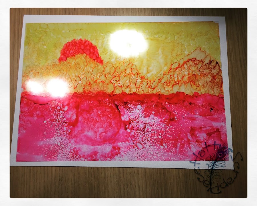 En esta usamos las tintas directamente sobre el acetato y las fuimos distribuyendo con pincel y otros utensilios.