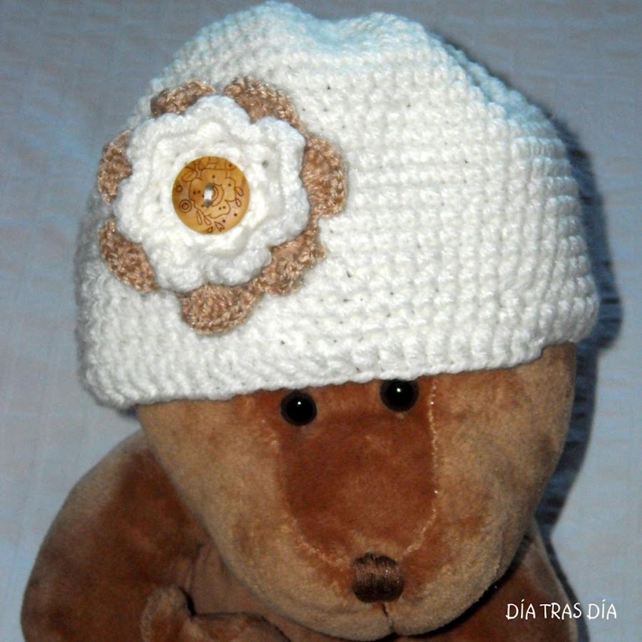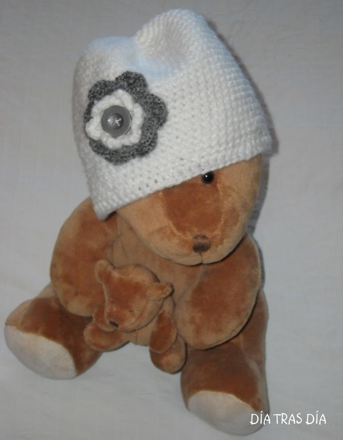 Como vi que le había gustado, decidí hacerle otro igual a ella, para que pudiesen ir las dos conjuntadas. En este caso, el broche-flor lo hice en otros tonos, combinando el blanco con gris, para que pudiese tener un broche distinto para combinar con otras prendas. Y este gorro quedó así: