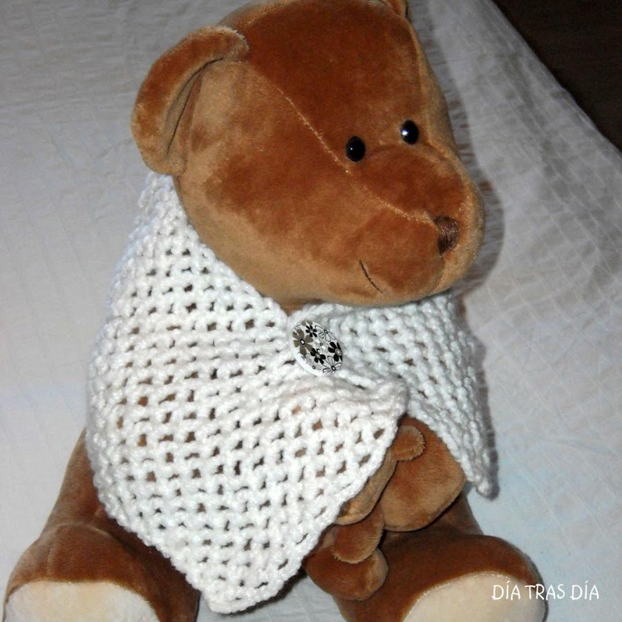 Y para Nuria se me ocurrió hacerle además, ya que tenía aún lana de la que usé para el gorro, un cuello bien calentito. El cierre se realiza con un botón de madera decorado con flores grises, que me dio Nuria, y que le aportó un toque muy simpático. Y aquí os enseño cómo quedó: