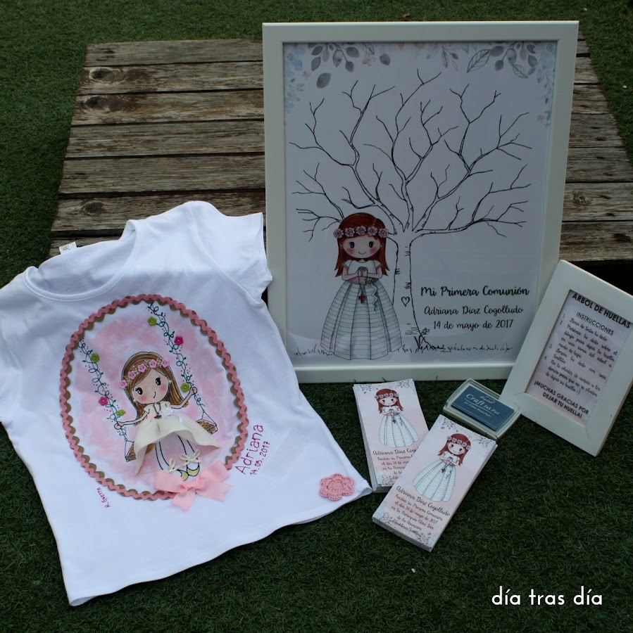 En aquella ocasión, además de los recordatorios, preparé para la comunión de Claudia una camiseta (la primera del modelo medallón), un cuadro con su dibujo personalizado y el tocado que lució en su gran día.