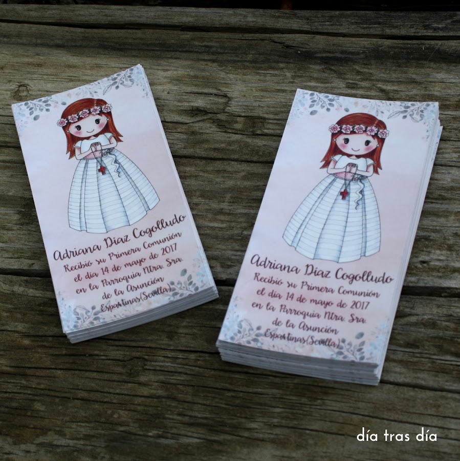Mónica es mi clienta más fiel desde hace años. Gracias a ella preparé los primeros recordatorios de Primera Comunión de Día tras Día, cuando Claudia, su hija mayor hizo la Primera Comunión hace ya 3 años. ¡Qué recuerdos!
