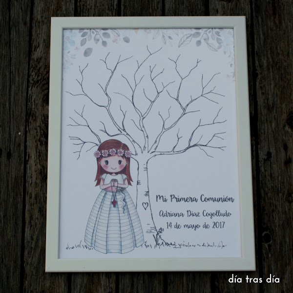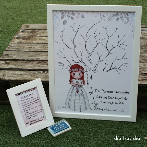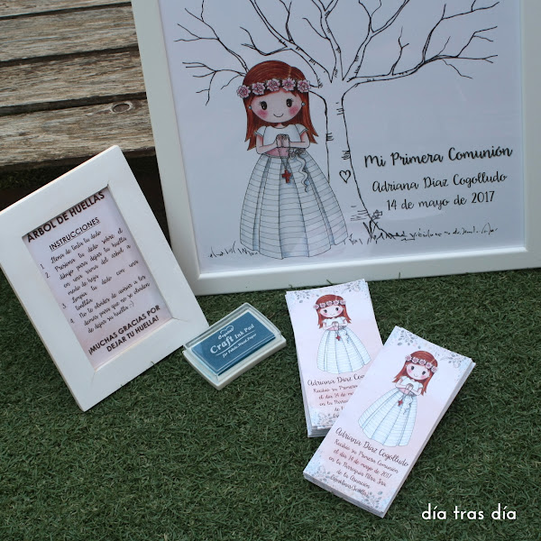 Y por último, y aquí es donde viene la novedad (que la he dejado para el final para darle más emoción), Mónica me dijo que si podía prepararle una lámina con un árbol de huellas, que lo había visto en varios sitios y le había gustado la idea para que se lo hiciera a juego con los recordatorios.