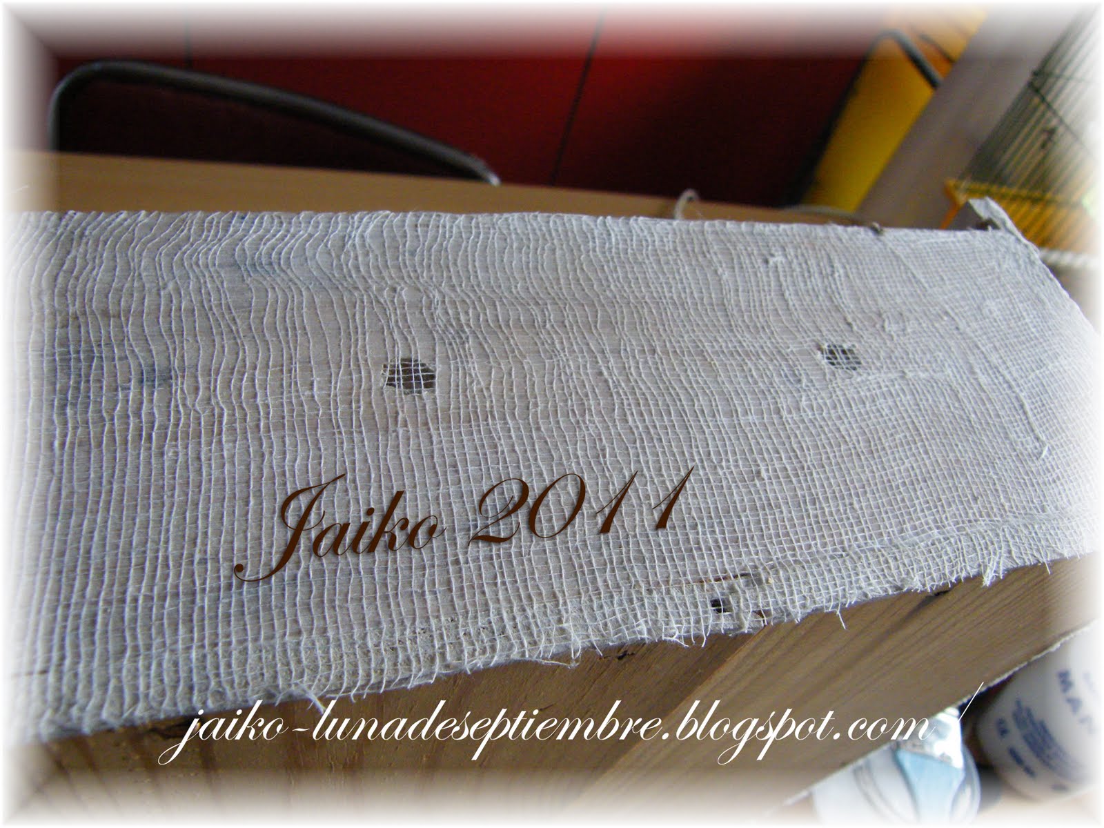 Una vez dada una mano de gesso y otra de blanco, esta con pintura acrílica, le pegué la gasa, con cola blanca y bien estiradita.