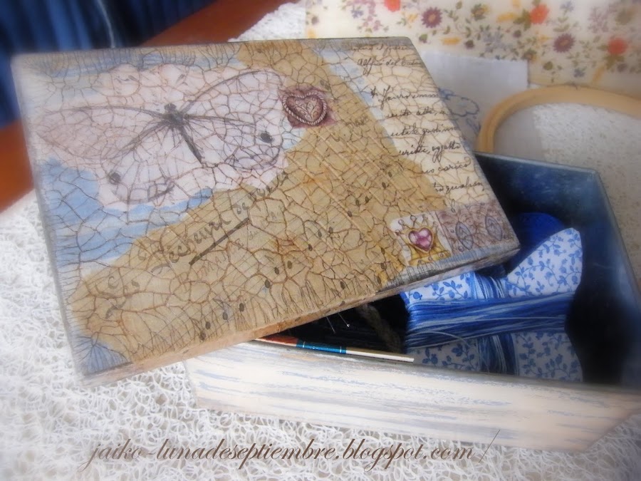 Y que me decís de la cajita donde guardo las cositas de mi bordado?? es un regalo que me hizo mi pelirroja favorita en Navidad, con sus hilos para acolchar, dedal, agujas.. vamos que sabia que iba a llevarme al huerto jajajjajaja y yo encantada!!
