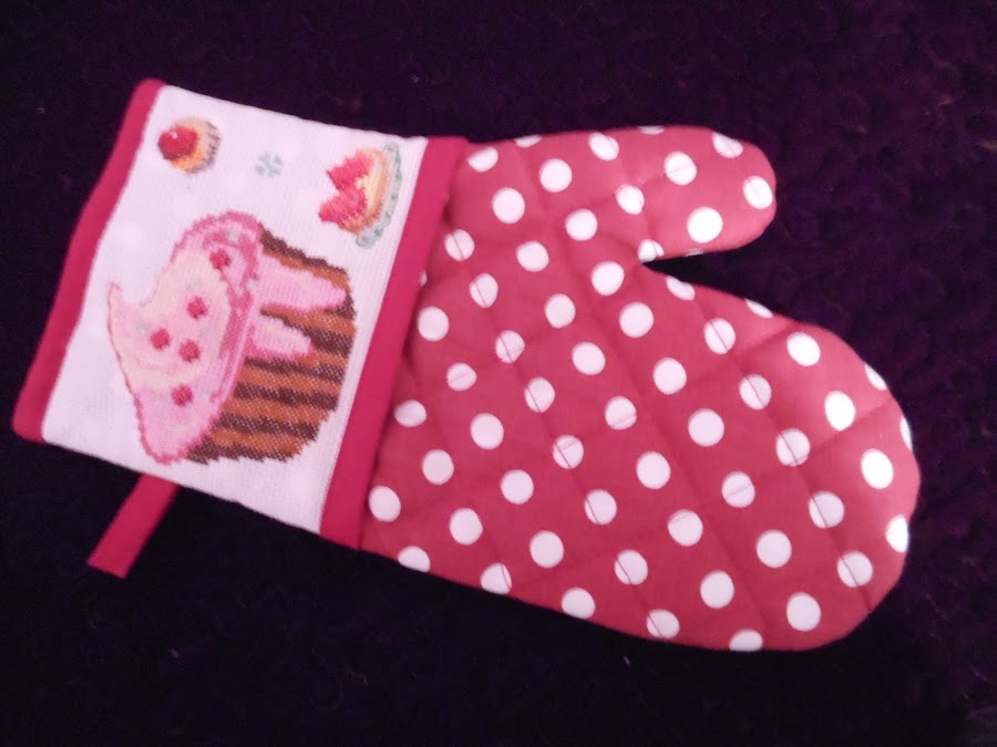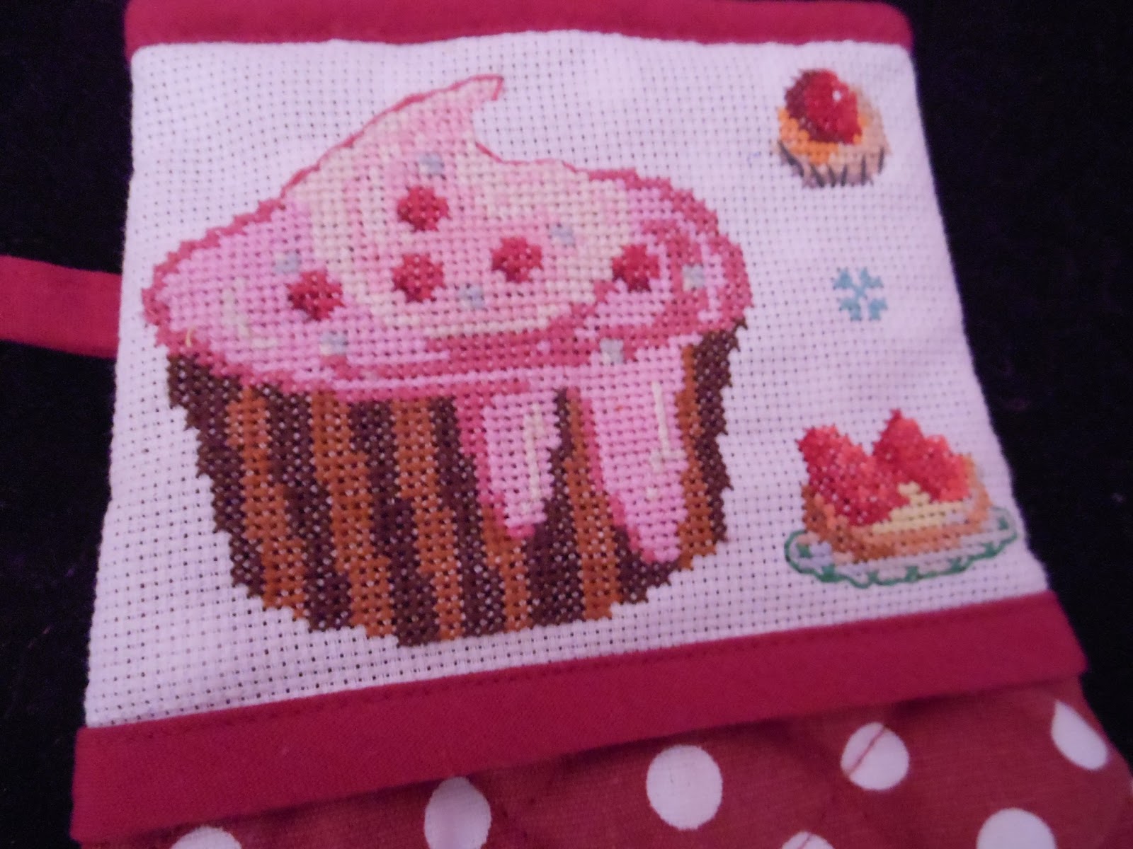 A los pies del árbol de Navidad, colgamos las botitas, una para cada uno y dentro ponemos 1 regalo que abrimos después de la cena de Nochebuena, en la mía, había esta preciosa manopla con varios gráficos para elegir el dibujo a bordar en PX y yo no pude esperar y me puse corre que te corre, a bordarle el cup cake y 2 pequeñitos dulces porque ya no me cabía nada más ,eran tan lindos