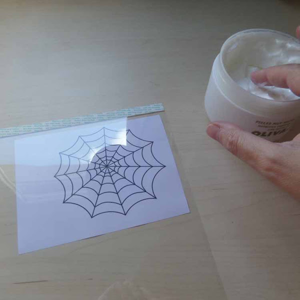 Vamos a utilizar pequeñas telas de araña como posavasos. Sacamos una plantilla de una tela de araña redonda que hemos impreso en papel (igual que la tenemos nosotras en la foto.) Encima de esa plantilla vamos a colocar una lámina de transparencias (las mismas que utilizamos en la entrada de la Tela de Araña) y la untamos bien de crema corporal o de manos para que luego sea fácil sacar la silicona.