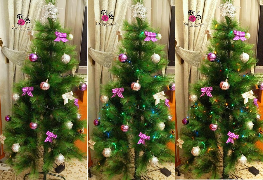 Este año hemos querido darle un toque distinto a nuestro árbol de Navidad. Hemos evitado los típicos colores (rojo, dorado y verde) para pasarnos al plateado y morado. Además tiene un toque muy especial porque hemos hecho los lazos a mano con cinta de envolver regalos. Ya que están carísimos los adornos. Y es una idea original, creativa, divertida y económica.