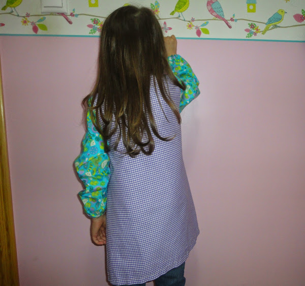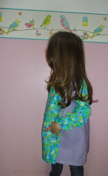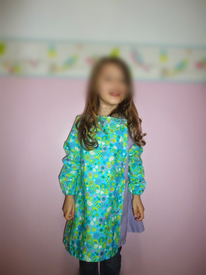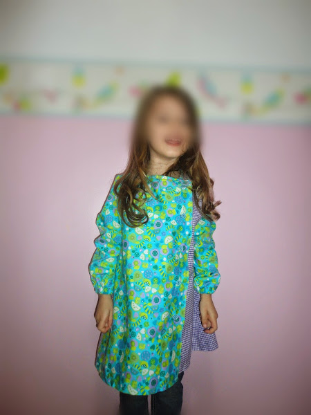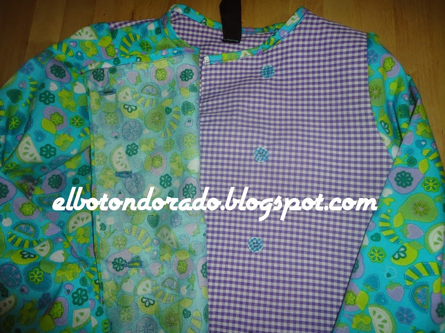A diferencia con la otra bata escolar, tiene los botones a un lado, las dos mangas iguales, bies de la tela estampada en el cuello y no tiene bolsillo, dice que no lo utiliza y no ha querido que se lo ponga.