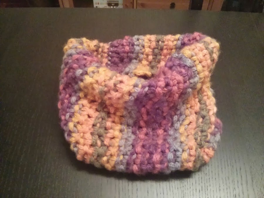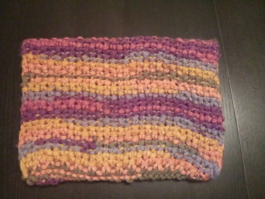 Esta realizada a punto de arroz, es mas ancha de lo normal, unos 35 cm y de larga unos 60 cm, después la he cerrado quedando una bufanda redonda.