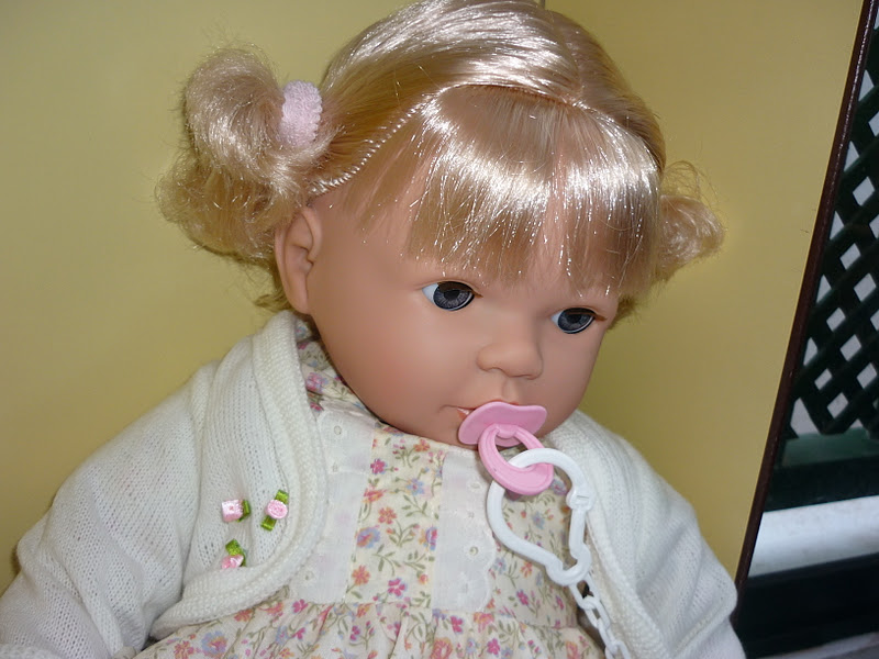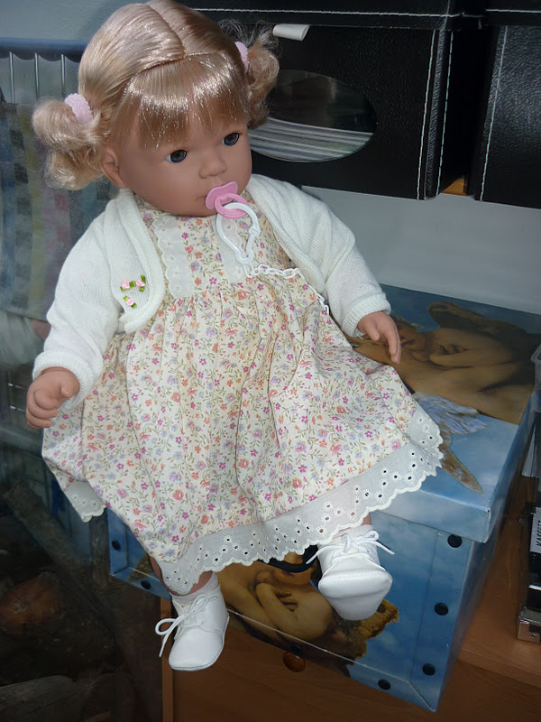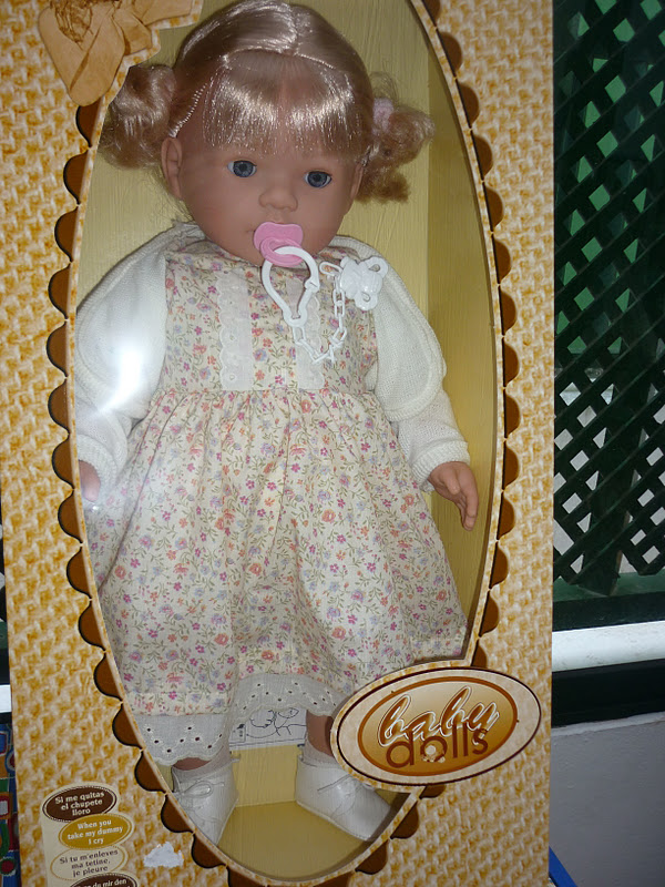 También quiero presentarles a la nena que mi marinovio me dejó por Reyes. Es una rubita encantadora de 64 cm. de la marca alicantina Baby Dolls. Tiene un vestdín y una rebeca muy lindas.