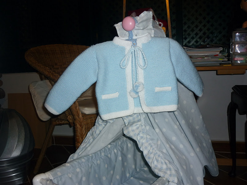Terminé hace un ratito una chaquetita para bebé de meses. Es el modelo para niño Tom, el de los pompones, pero en chiquitín. Me lo encargó Madaly para el chiquitín de su amiga y quedó muy dulce en celeste y blanco, con unos pompones chiquitines.