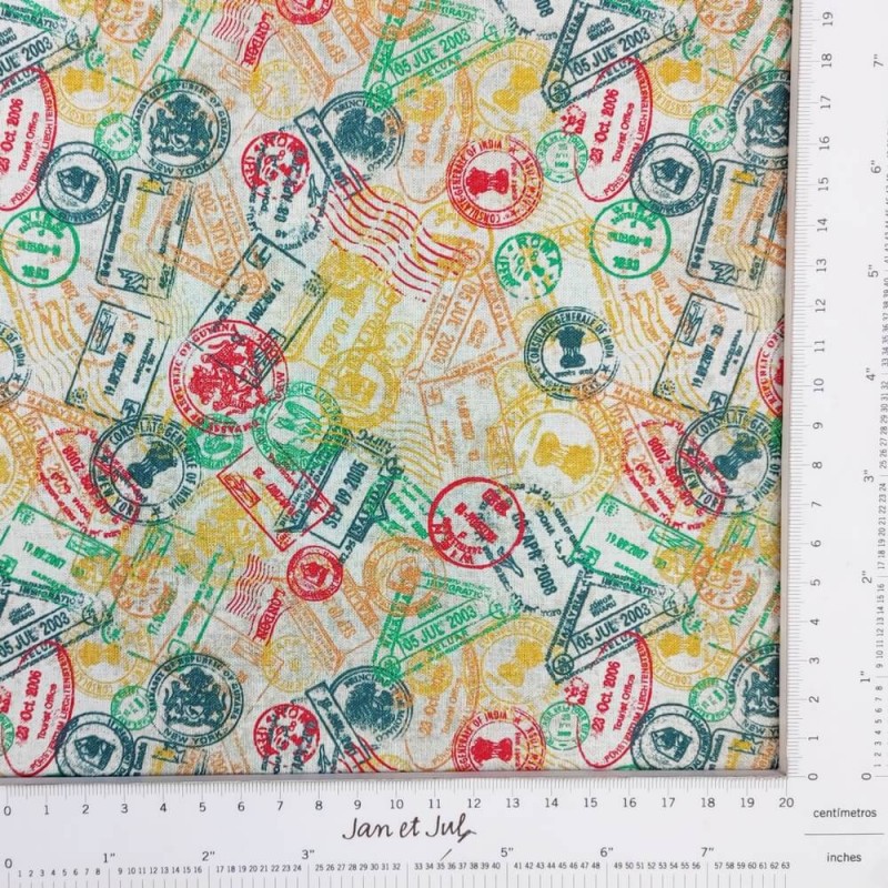 En esta colección también encontrarás esta maravillosa tela con sellos de viajes multicolor, representando los sellos de entrada a diferentes países que nos ponen en los pasaportes: