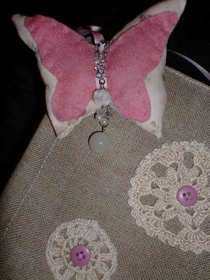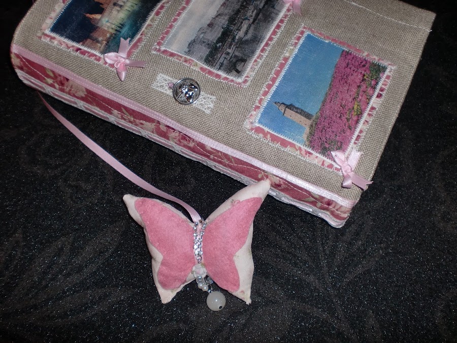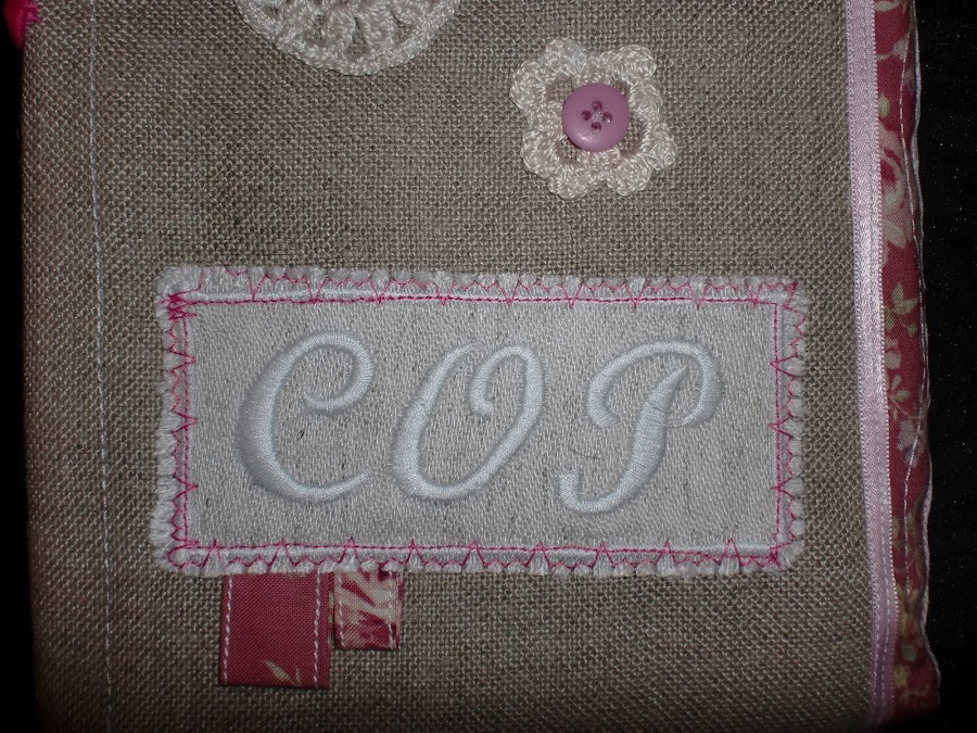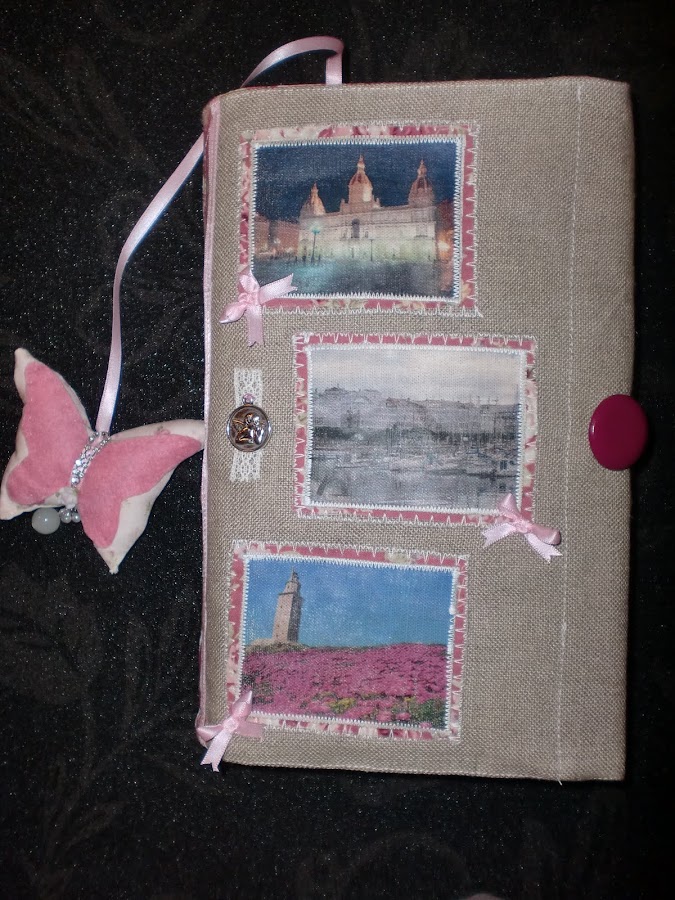 Cuando me envió esas fotos, me comento que su amiga era especialmente romántica. Decidimos que en el interior le ibamos a colocar una tela lecien de las mas bonitas que tengo, sus tonos rosados le iban fantasticamente a las flores que adornan una de las fotos. El resto fue saliendo solo, iniciales, puntillas, lazos, la medalla del ángel....Mabel no quería escatimar gastos para su mejor amiga y quería que cada vez que viera esa funda cubriendo sus amados libros se acordara de ella.