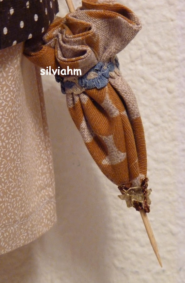 Esta con gabardina, se la llevó Esther para regalársela a su hermana, junto con unas matriuskas.Este modelo con gabardina, pese a ser una de las más complicadas de hacer, es una de mis favoritas, y en estos tonos marrones aún más. Como complemento, este mini bolso de boquilla y su paraguas.