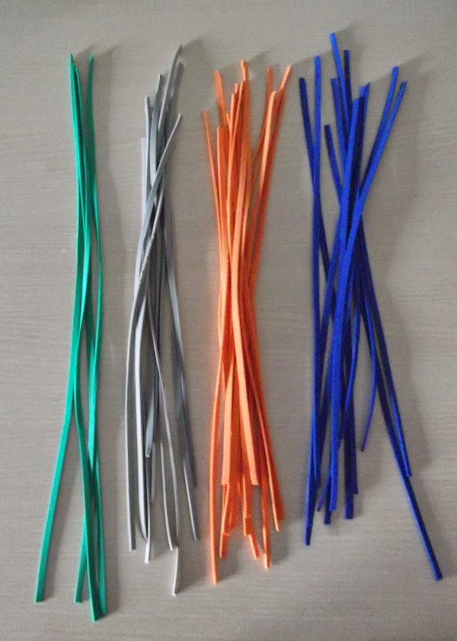 Una vez elegidos los colores vamos cortando tiras de medio centímetro y de la parte más larga de la goma eva, ¡más vale que sobre, que no que falte!