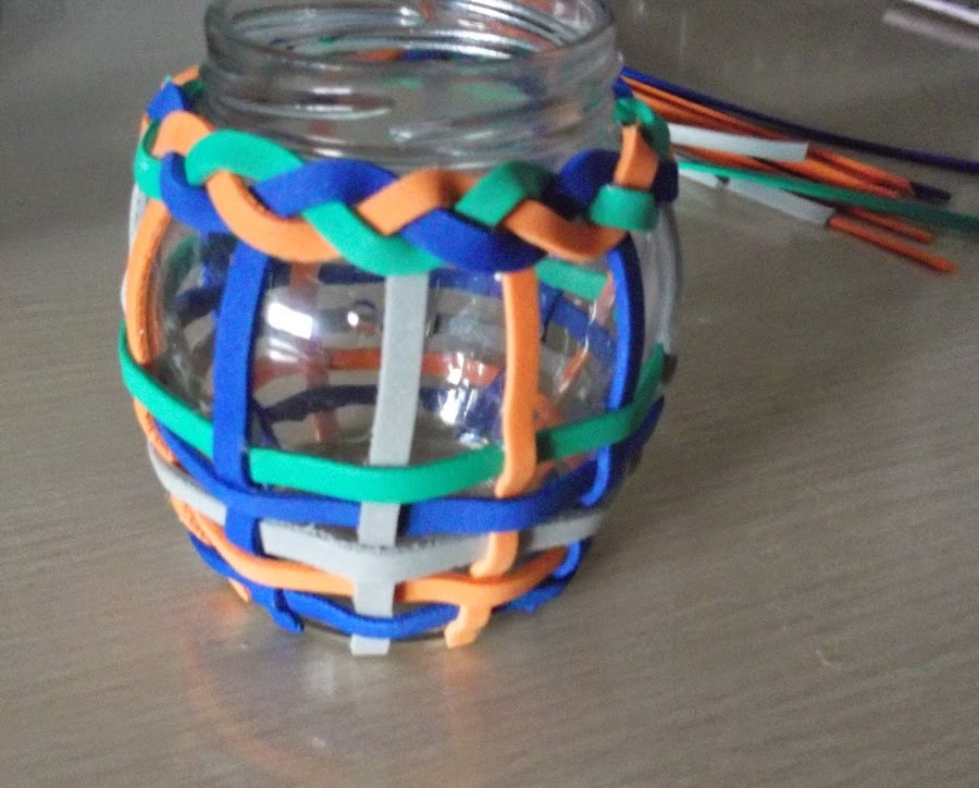 ¡Ya hemos terminado de tejer!. Ahora pegamos las tiras verticales de forma recta hasta la boca del tarro.