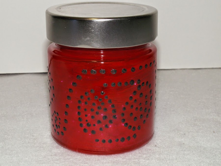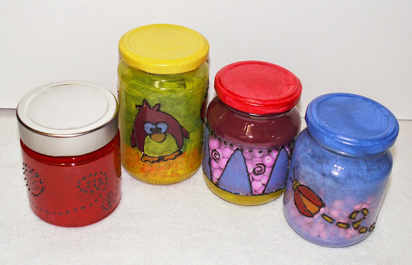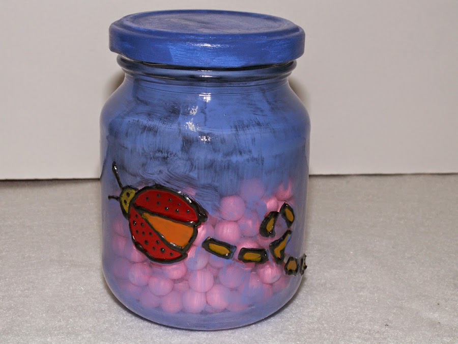 Lo primero que he hecho ha sido limpiar muy bien la superficie de los botes con alcohol, para retirar los restos de pegamento que quedaban de las anteriores etiquetas. Después los he pintado con pintura cerámica translucida, para que me permita ver el interior un poco y así saber de que color son los abalorios que guardé dentro y tenerlos bien controlados. Los contornos de los dibujos, así como los motivos, están hecho con contorno de relieve, imitando el plomo de las vidrieras, lo que hace que dichos contornos sobresalgan en la superficie del bote.