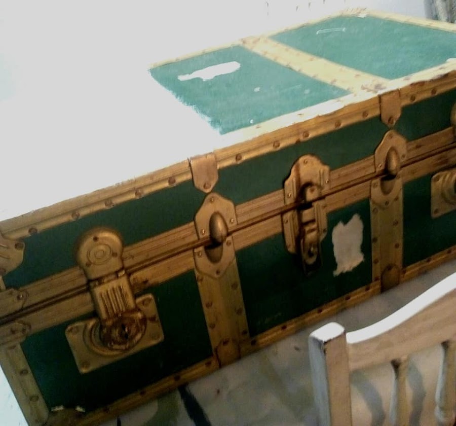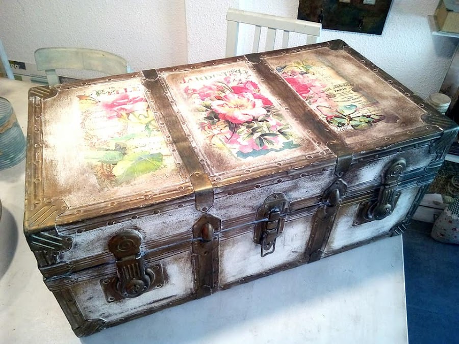 Un baúl grande, de 80x30x40 cm, muy trabajado con patinas y entelado por dentro con una tela de ramas de cerezo preciosa.