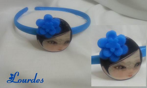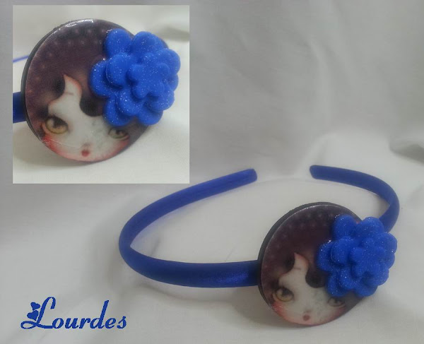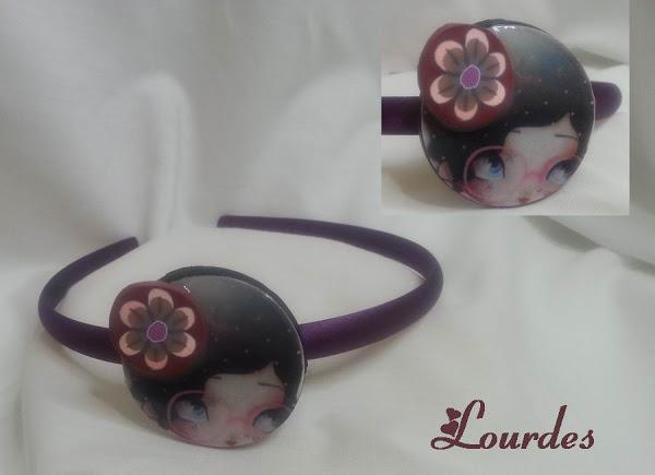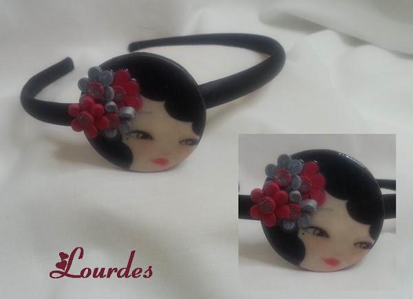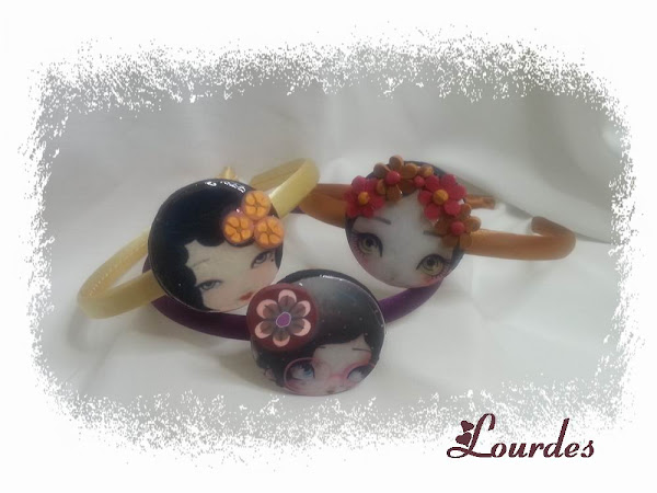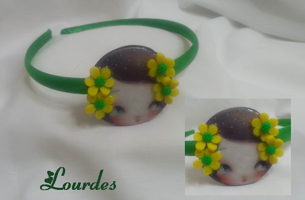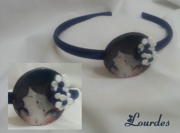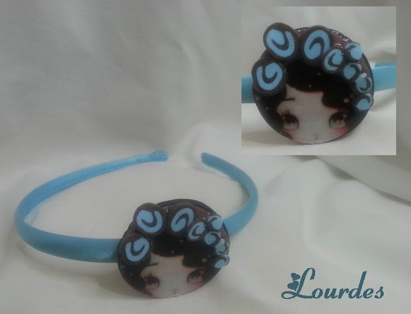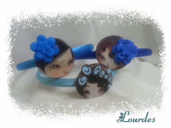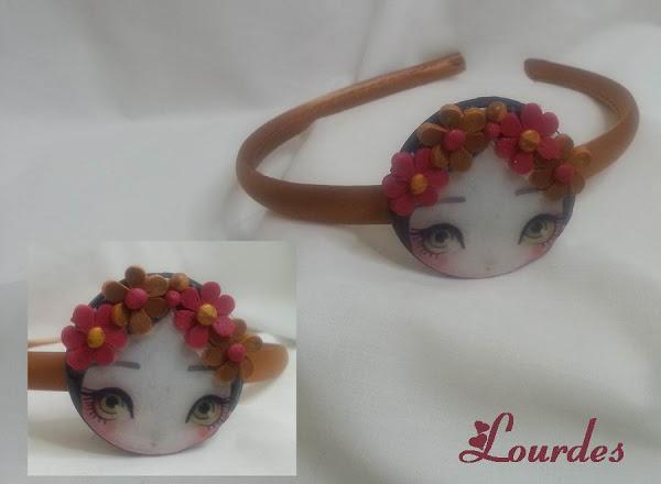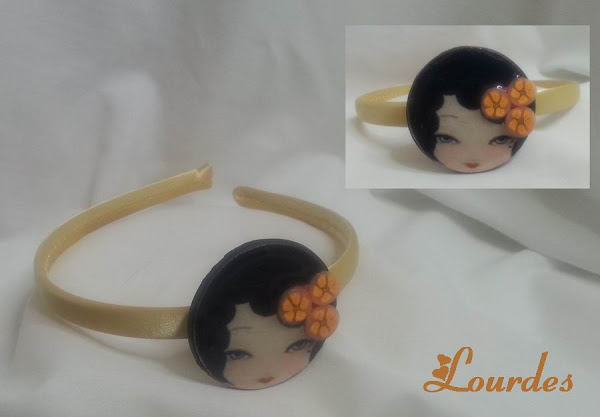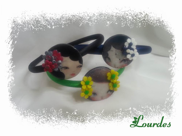 Diademas de diferentes colores con caritas barnizadas y decoradas con arcilla polimérica.