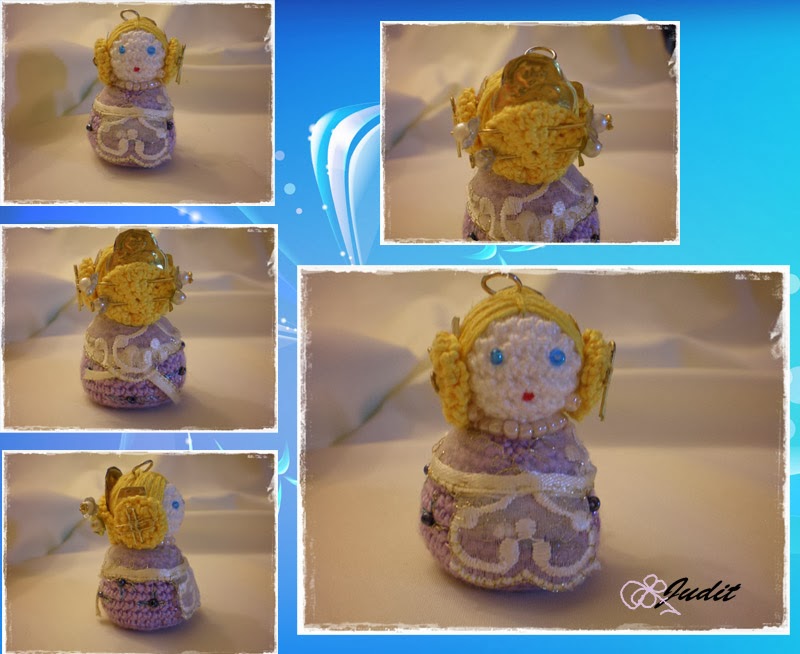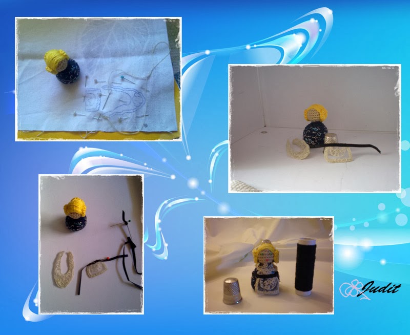 Por ejemplo, tanto la manteleta como el mandil los hice en tul, gran trabajo pues nunca lo había hecho.Las peinetas van en plata y los pendientes son alargados y se mueven.De alto se puede comparar con la bobina de hilo y el dedal, son bastantes pequeñas, unos 5 cm.