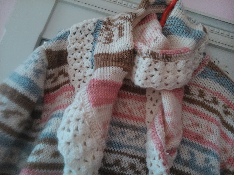 la bufandita a juego y rematada a ganchillo en un hilo crudo ,creo qué le da más vida al jersey....
