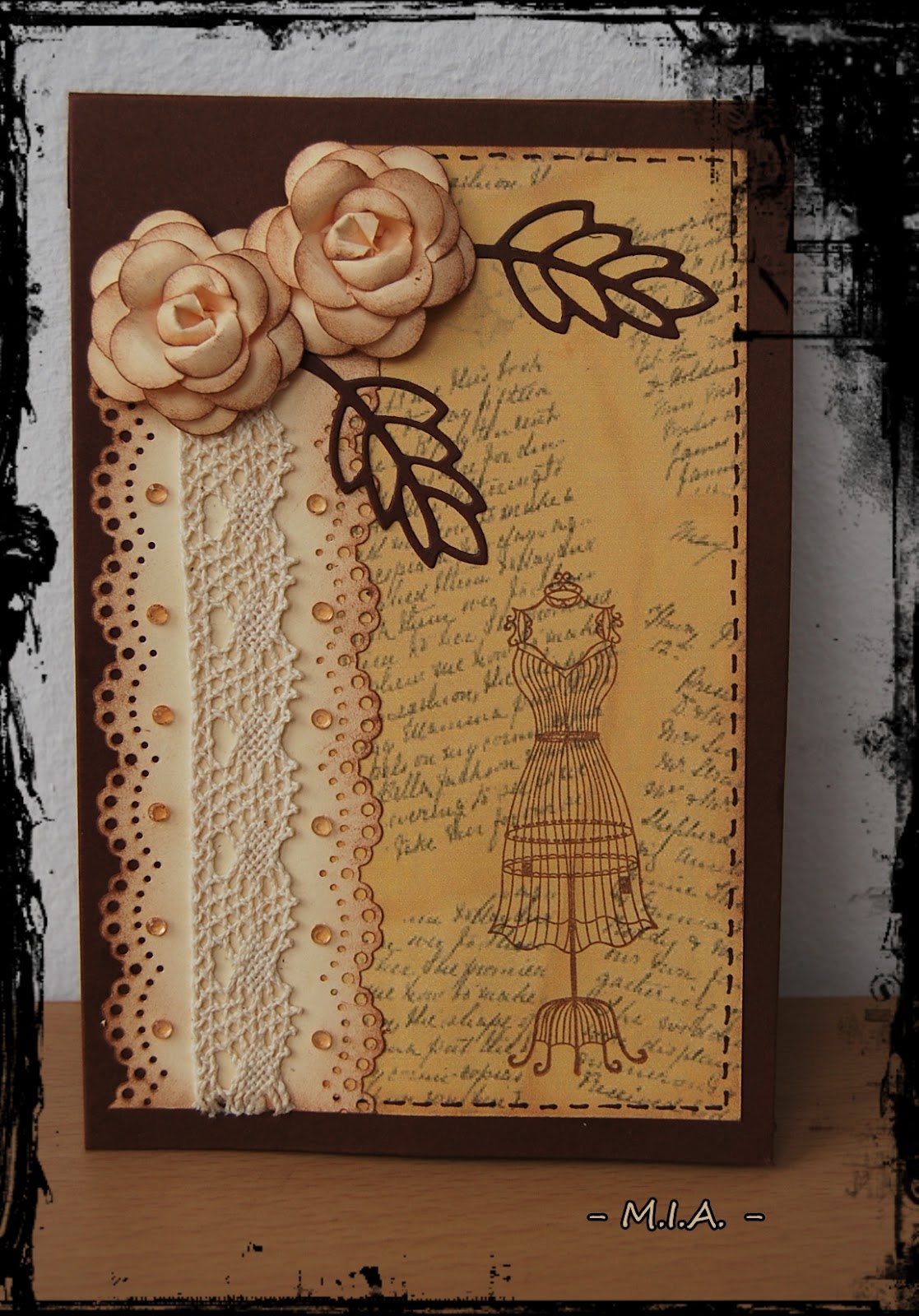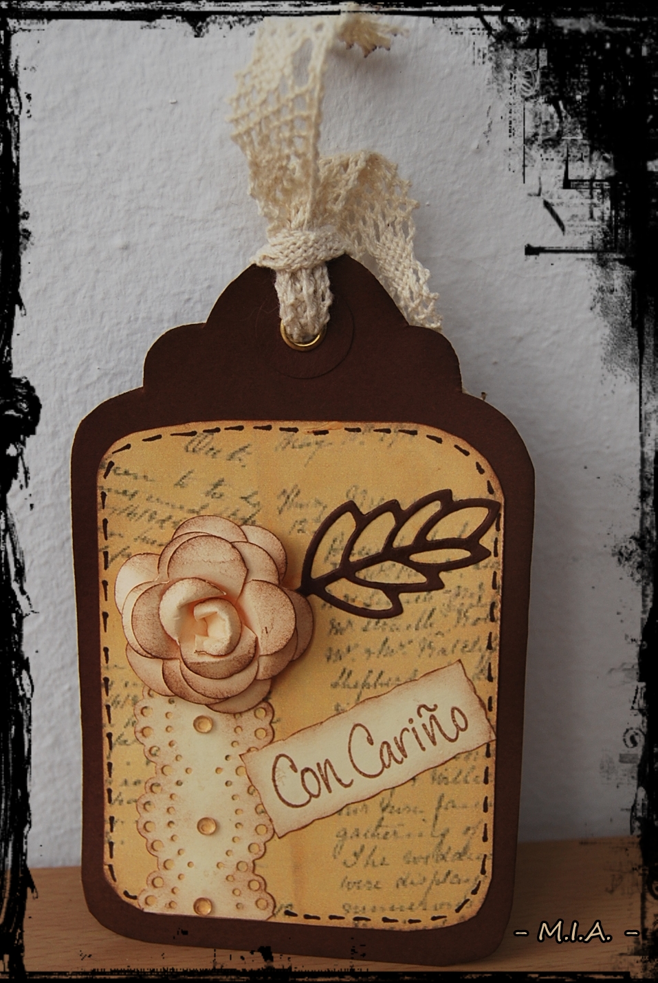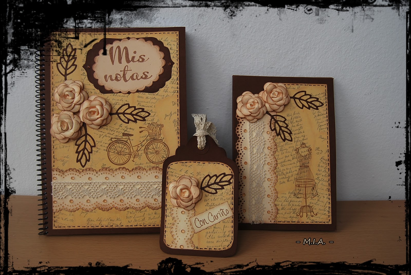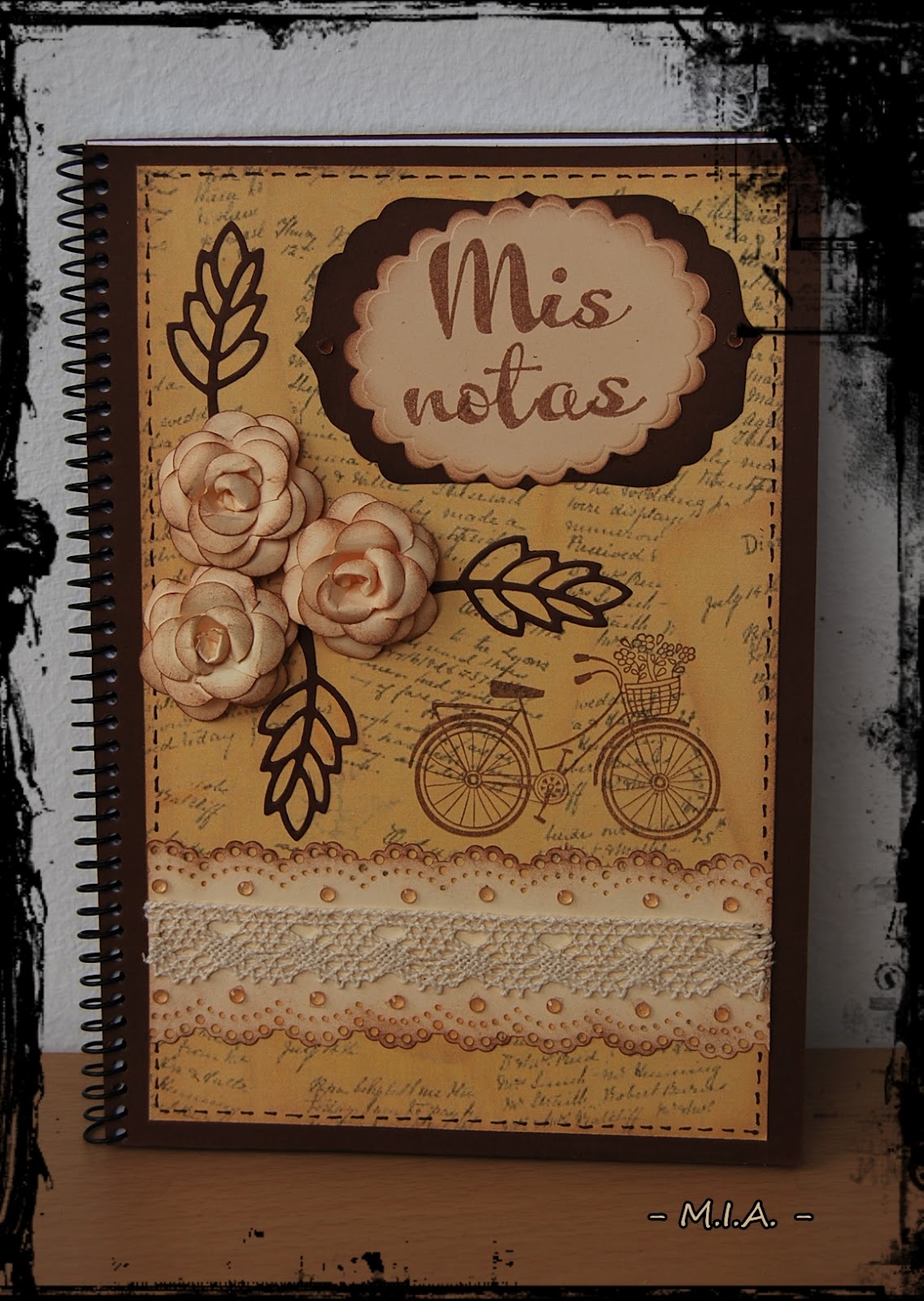 El papel no sé de qué colección es porque hace mucho que lo tengo. Lo he combinado con cartulina marrón chocolate y crema. Sobre un troquel scalop ovalado he estampado "Mis notas" con tinta versafine sepia vintage. Las rosas caserasen crema van acompañadas de un troquel de hojas en cartulina marrón.