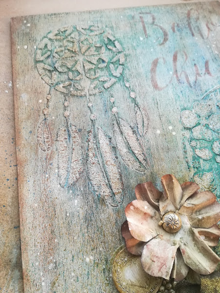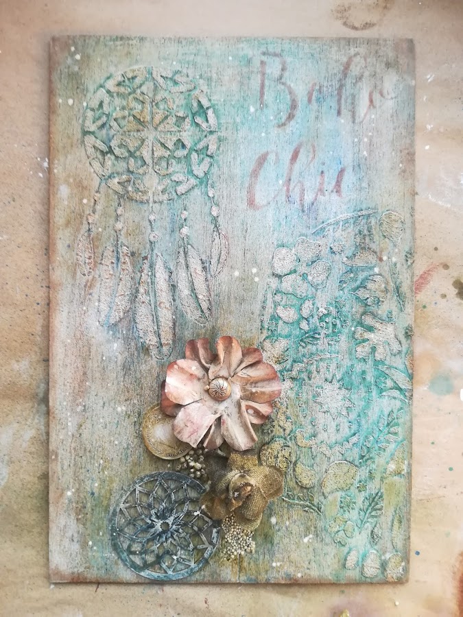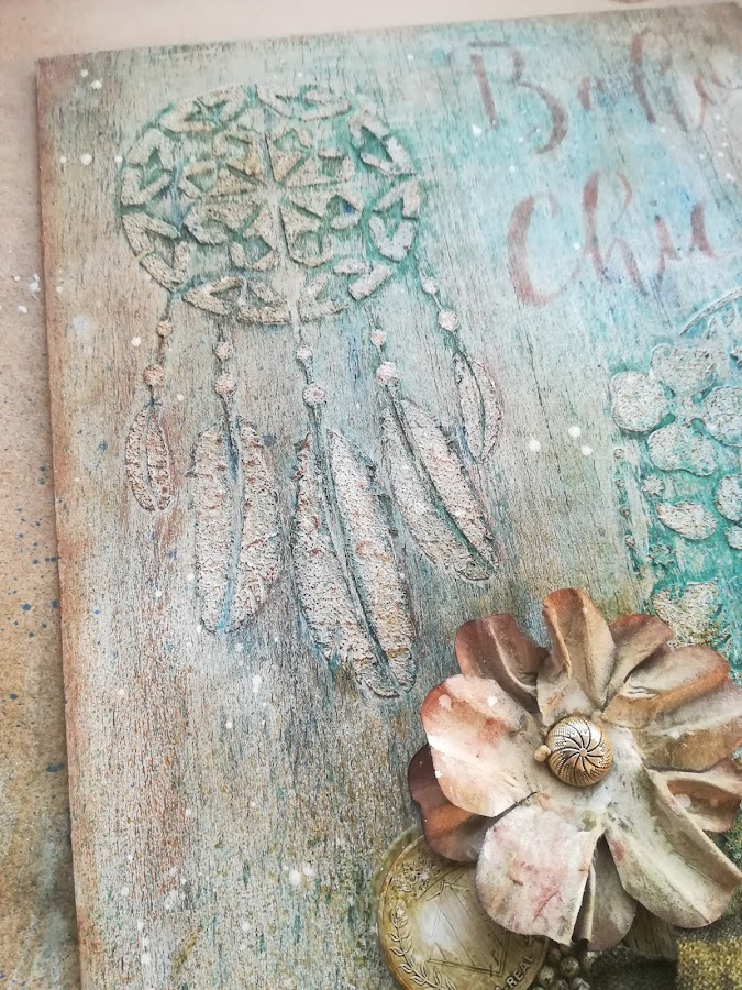 En las fotos de más arriba podéis ver los relieves que hice, y cómo queda después de aplicar tintas en spray de distintos colores, verdosos y azulados. Me chifla el resultado¡