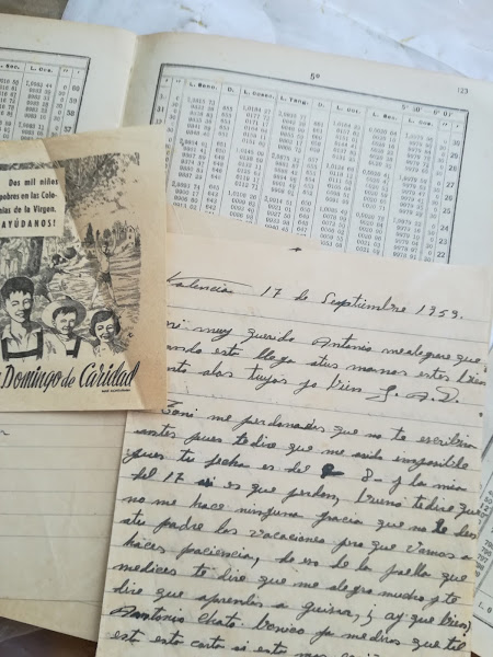 Luego me acordé de un libro que compré hace meses en el rastro. Al ir a arrancar algunas hojas para hacer decoupage, me encontré cartas....cartas familiares de 1959. Qué sensación...estar leyendo intimidades de una familia desconocida...ufff....y de unas personas que a saber dónde están, o siquiera si están....