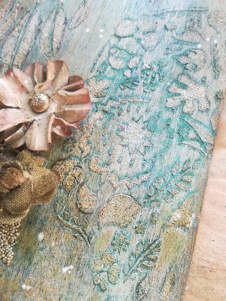 Con una espátula fuí poniendo la pasta, arrastrándola....al tener como piedrecitas en su composición, tiene una textura muy especial, parece cemento totalmente¡ Después de ponerla, me pareció que "destacaba" demasiado, asi que le di una pasadita de Gesso para matizar un poco...
