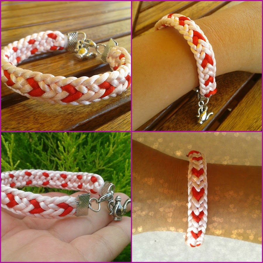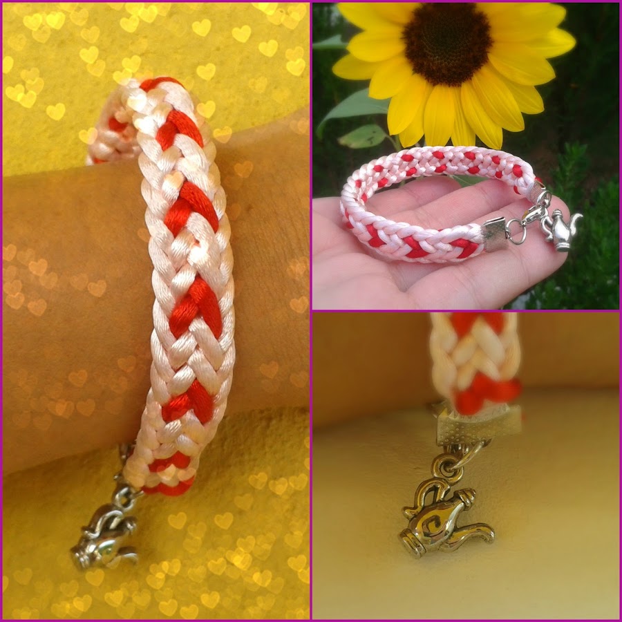 Hoy os traigo un par de pulseritas que he hecho estos días. La primera es de Kumihimo plano, en color rosa pálido y dibujo de corazones rojos, le he añadido un charm de una tetera y me encanta cómo ha quedado, creo que haré más en otros colores, ya os las iré poniendo: