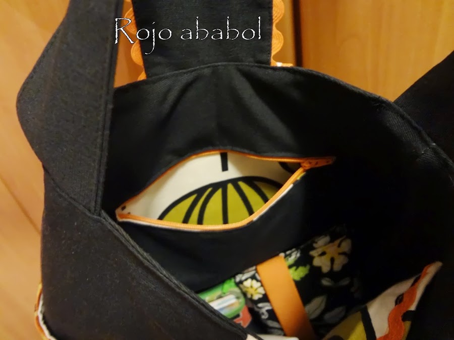 En el interior dos bolsillos, uno cerrado, tal y como hicimos el bolsillo con cremallera en el Cose Conmigo. El interior con la tela estampada contrasta muy bien con el forro negro.