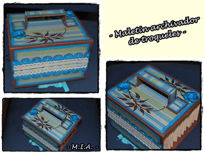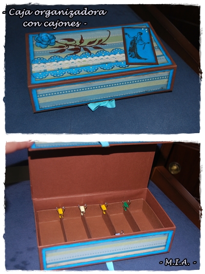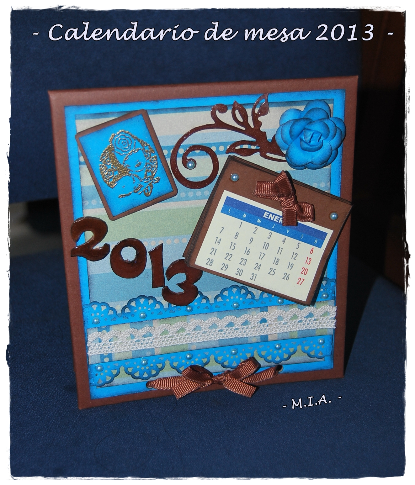 Todo está hecho desde una trozo de cartón que forré con carutlina marrón chocolate y luego adornado con cartulina celeste y papel del taco papeles. Usé troqueladoras, lazos, cintas y puntilla crema. Las flores caseras y los troquelados en la misma cartulina marrón chocolate. Las letras, los arabescos y los números del calendario están embosados con polvos transparentes. Y las damas están embosadas con polvos dorados. Y este ha sido el resultado de las cosas que le he mandado...