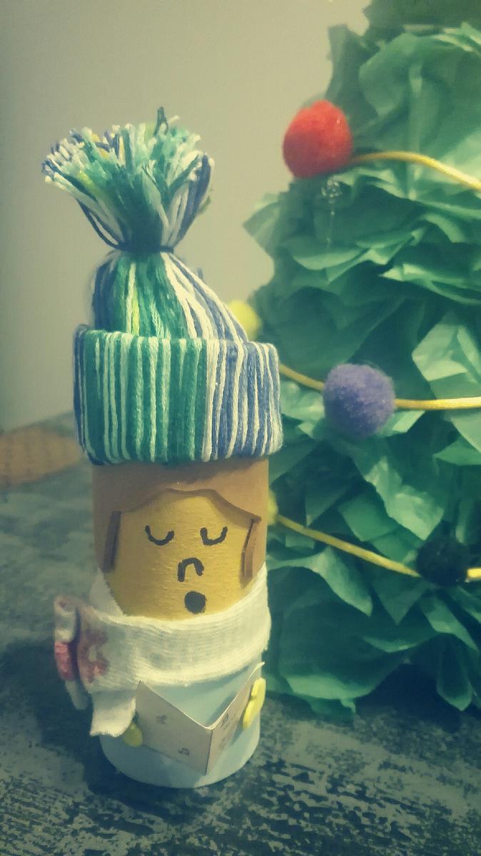 Para los cantantes 2 rollos de papel de WC y retales de goma Eva que había por casa. Las cara las pintamos, las bufandas las hicimos con calcetines viejos y los gorros con un trozo de rollo de papel de WC e hilo (lana que había por casa, de ahí que hayan tantos colores diferentes).