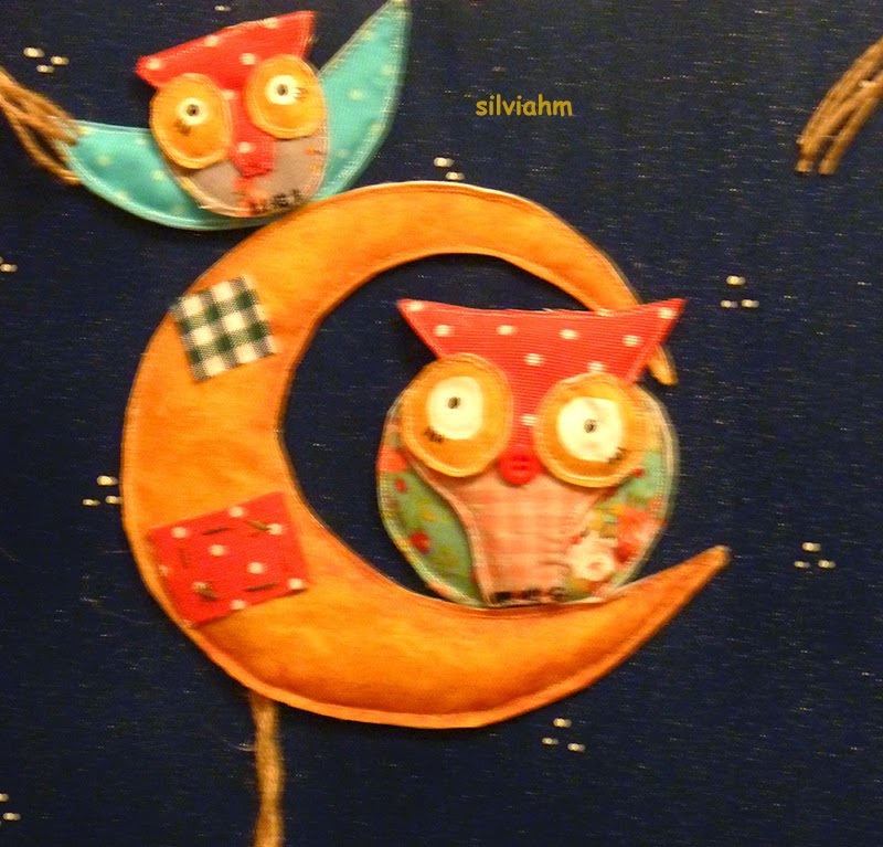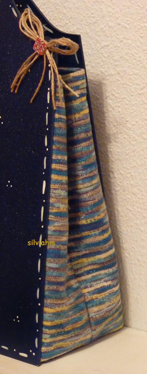 Para empezar, he hecho este revistero en azul oscuro salpicado en blanco. Como motivos, unos buhos en la luna y una estrella colgando. Ha quedado precioso. Las bases son en madera y entre ambas lleva una bolsa muy bien armada, de 35x35x15 cm. de ancho, con base de madera para que quede perfecta, incluso vacía.