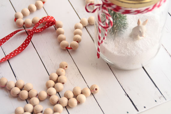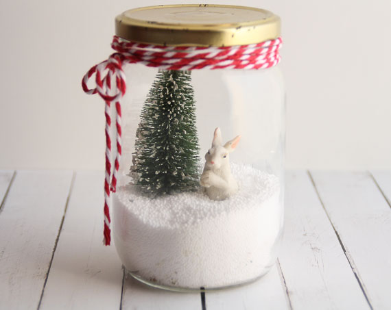 Le dimos la vuelta y lo convertimos en un bonito tarro decorado con nieve, un pino y un dulce conejito, adornado de un cordón trenzado rojo y blanco.