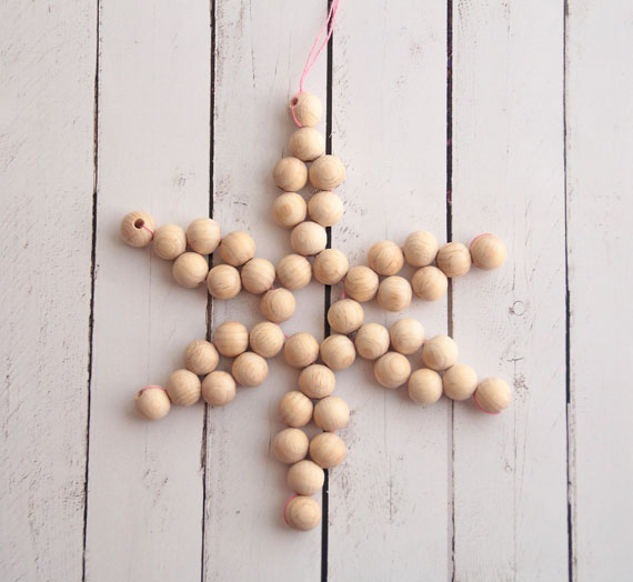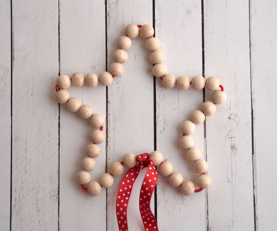 Seguimos con un adorno para el árbol de navidad. Elaboramos una estrella usando las bolas de madera natural de 12mm que tenemos en la tienda, un poco de alambre e lazo rojo.