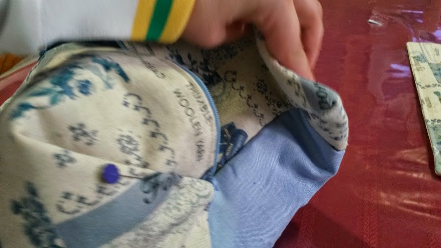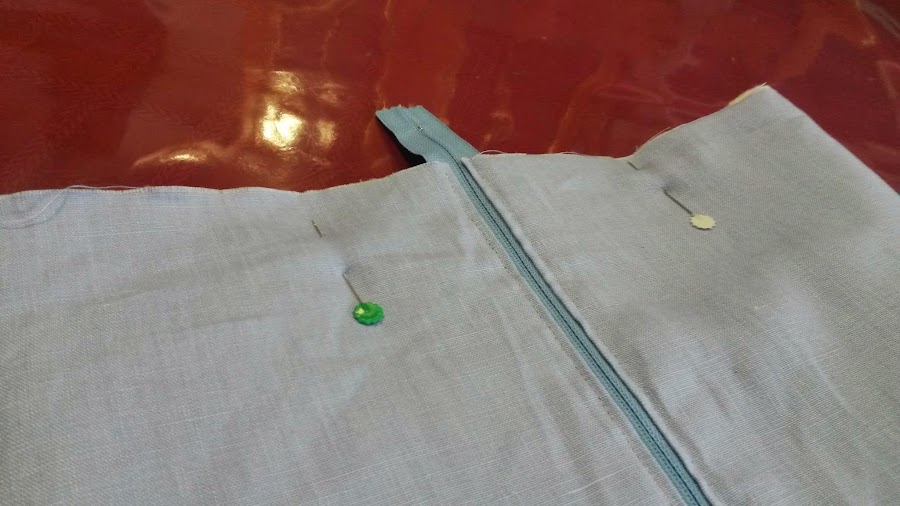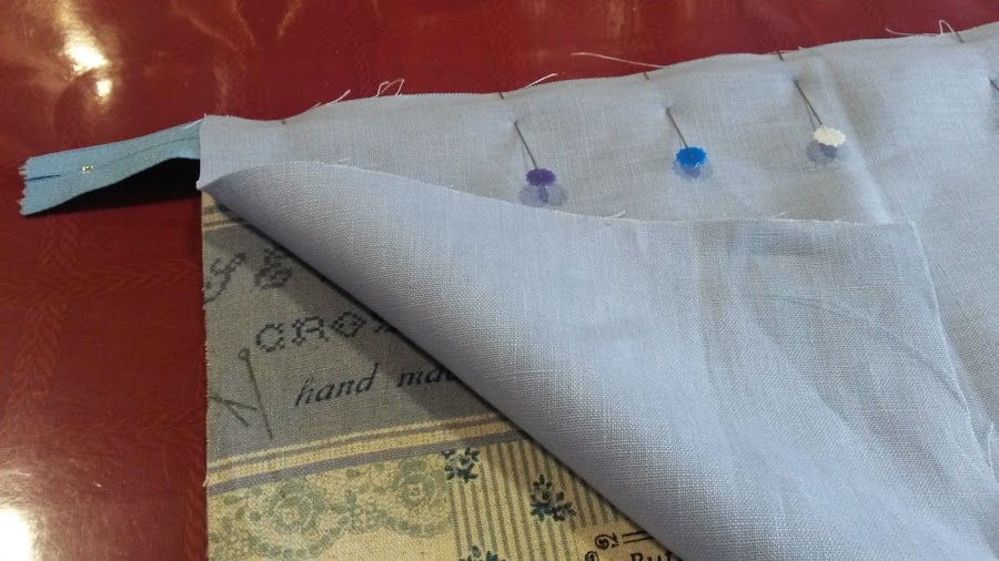 Colocaremos lo primero la cremallera, para ello, la pondremos como vemos en la foto, con los dientes mirando a la tela exterior y bien alineada con la tela, posteriormente, colocaremos la tela de interior encima y lo prenderemos con alfileres.