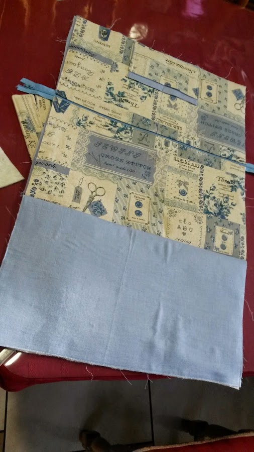Ahora coseremos los bolsillos, calculamos el centro de la labor, fijáos en la marca de la foto. y lo coseremos al ras de la parte inferior y luego los costados. Podemos dar un pespunte en el centro para hacer 4 compartimentos.