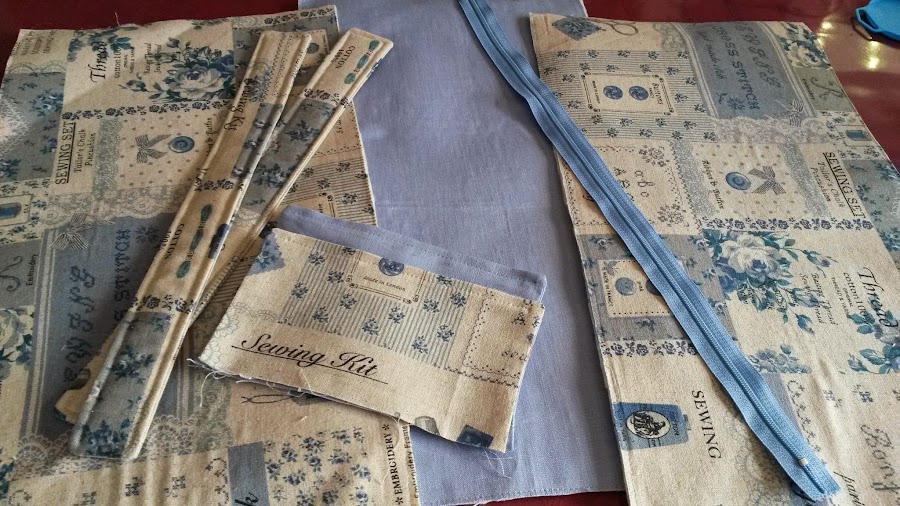 3 trozos de tela exterior de 25x45cm (si lo hacemos combinado el exterior, cortaremos dos trozos de una tela y un trozo de la otra). En nuestro caso, hemos utilizado una tela azul lisa de interior y la hemos combinado en el exterior también.