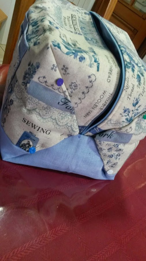 Nos queda como vemos en la foto, como dos triángulos. Hacemos esto para que dentro de la bolsa no queden costuras. Posteriormente abriremos la cremallera y daremos vuelta.
