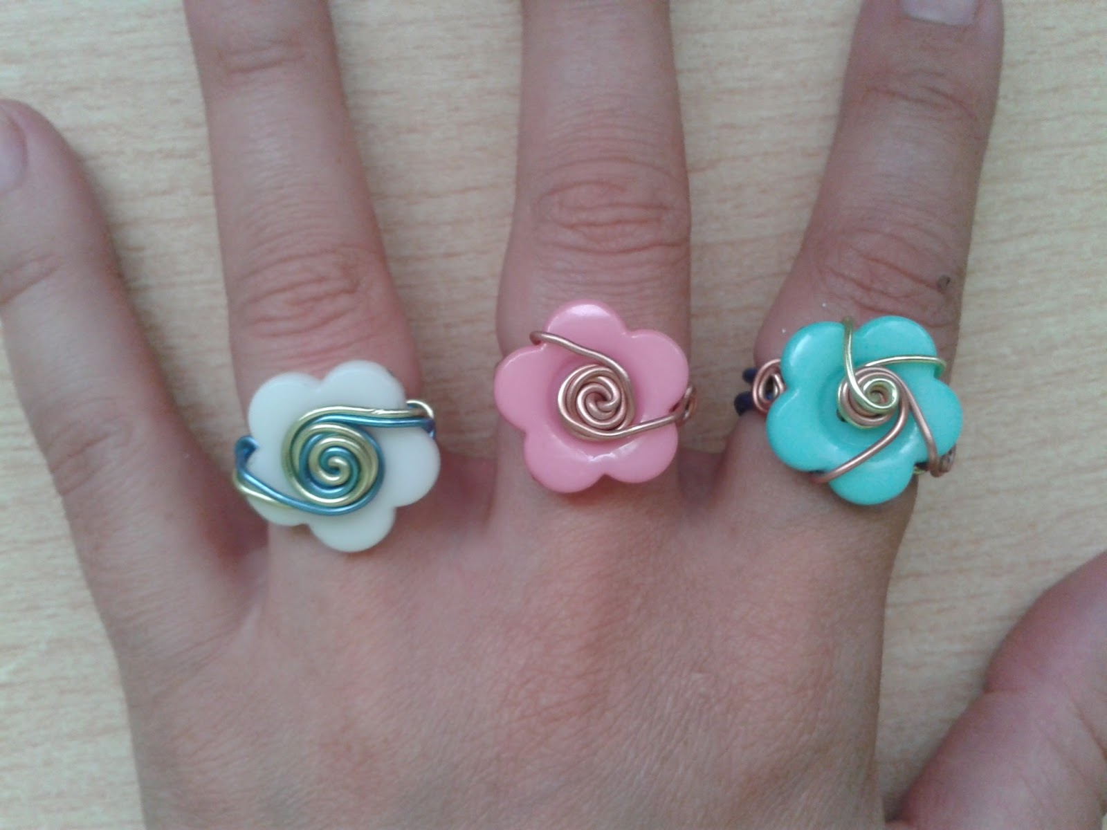Estos días he dejado de lado mi aprendizaje del ganchillo para amigurumis y he hecho unas cositas con alambre, ya que os tenía un poquito abandonadas. Esta vez le he añadido a los anillos botones con forma de flor, que son ideales para la primavera. También he hecho mis primeros colgantes con alambre, como en todo, los primeros siempre salen un poquito mal, pero aún así he querido compartirlo con vosotras, espero que os gusten: