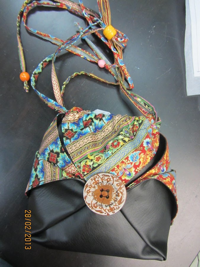 Después de unos cuantos días sin decir nada, os enseño los bolsos, y bolsitos que estoy preparando para esta primavera, que ya esta muy cerquita. Primero una cartera en loneta negra con tela de algodón estampada, con ese zig zag tan de moda, los colores elegidos el rojo y el azul, decorada con botón forrado y moña de la misma tela, cadena plateada para llevar del hombro. Por delante Por detrás S ...
