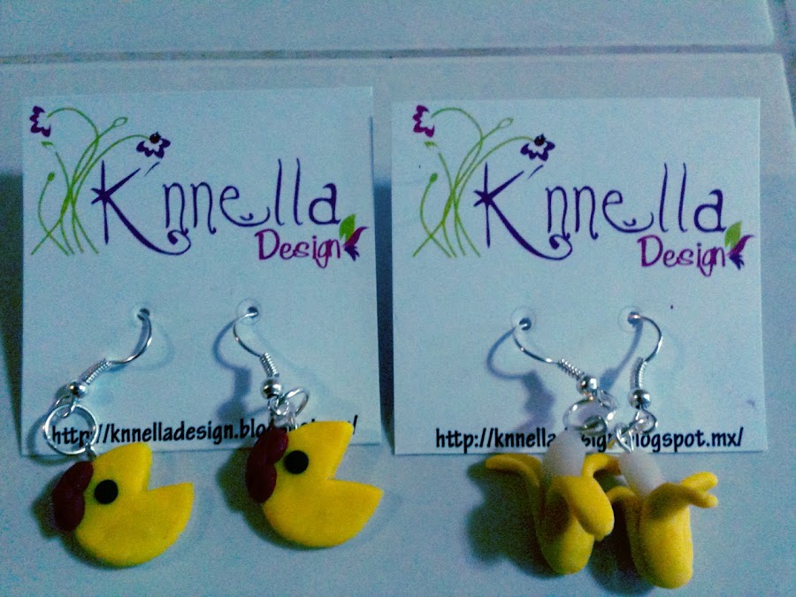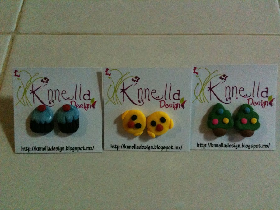 Aretes de la señora Pac-man, unos camburcitos o bananitas, unas gotitas, unos gallitos, cupcake, pollitos y ya muy cerca y para andar a tono, unos arbolitos de navidad :D