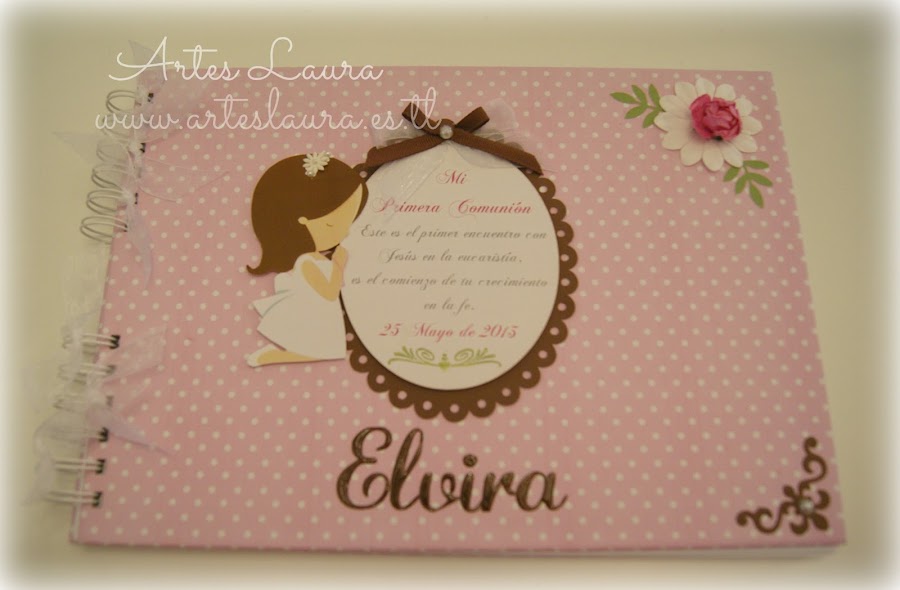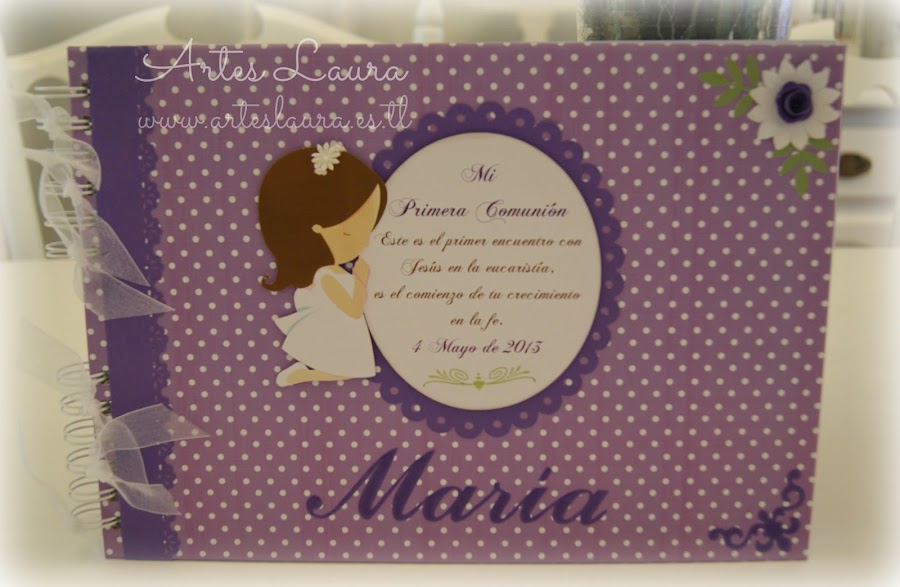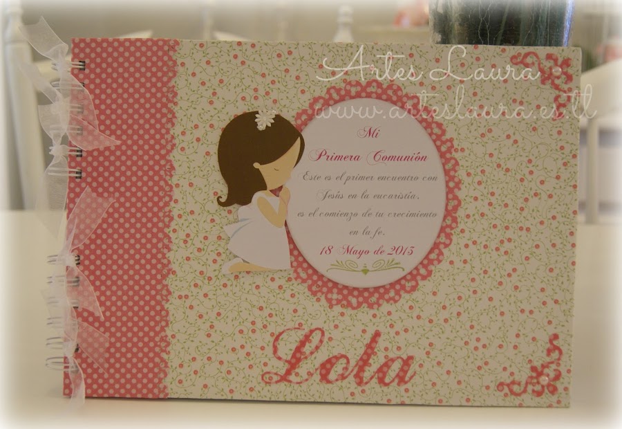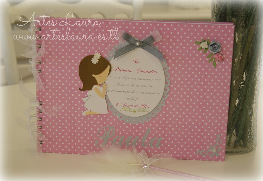 Hola a tod@s, ya estamos de lleno inmersas en las Comuniones. Este año quizás un pelín antes, pero veo que no soy la única pues noto poco movimiento por aquí, se nota que estamos tod@s a tope. Hoy os enseño el conjunto de caja y libro de firmas en tonos lilas de la guapisima Lucía, junto a los regalos que repartirá, unas minilibretas con bolígrafo. También un juego de escritorio en tonos rosas co ...