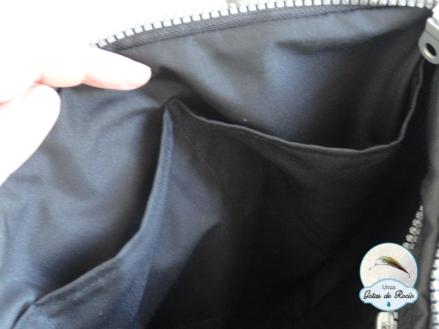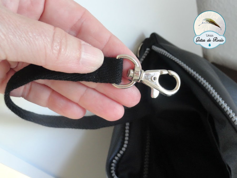 El interior además del bolsillo con cremallera lleva estos otros y un cordón con un mosquetón para localizar con rapidez las llaves.