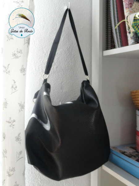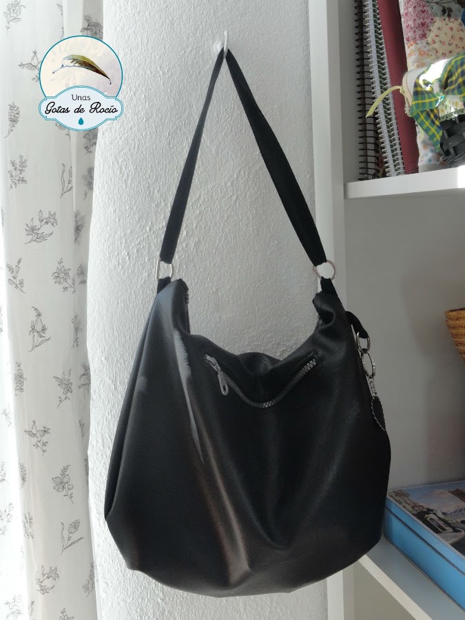 Se trata de un bolso de polipiel negra con cinta de algodón para el asa, forma redondeada, resistente al agua y flexible. Dependiendo de cómo te lo cuelgues o de lo que lleves en el interior, el bolso acoge una forma u otra.