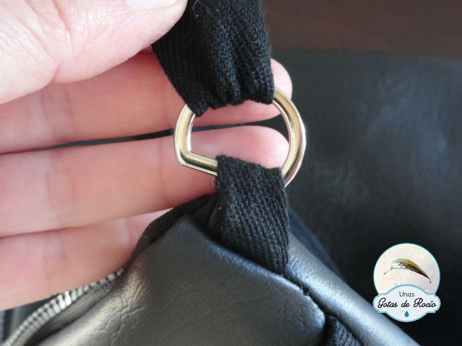 Las asas llevan estas arandelas para colocarles si se desea otra asa más larga con mosquetón y así colgar el bolso a modo de bandolera (este asa larga Mar la va a reutilizar de otro bolso que ella tiene).