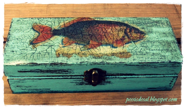 El segundo intento ha sido una caja y con la misma técnica, pero esta vez, la segunda capa de pintura ha sido en color turquesa, para que el "pescadito" estuviera ambientado... y la diferencia es que con ella sí me he atrevido a aplicar el craquelado...tenía menos que perder , me parecía a mi... Y l verdad es que me ha gustasdo el resultado también, totalmente distinto, se nota mucho más la pátina porque la resalta el craquelado.
