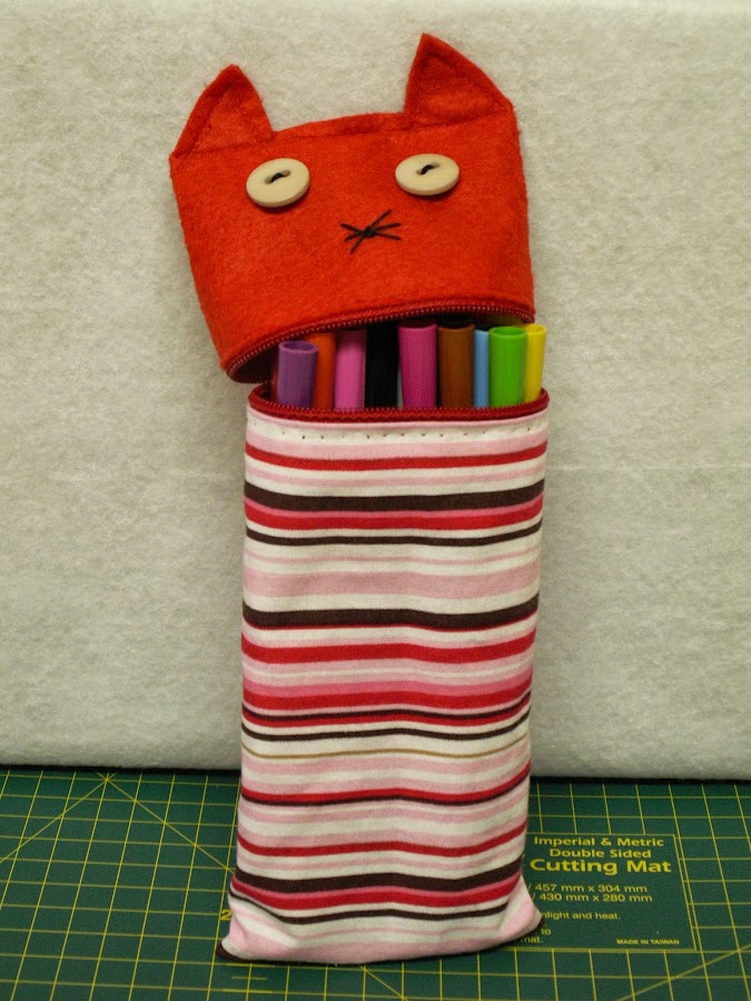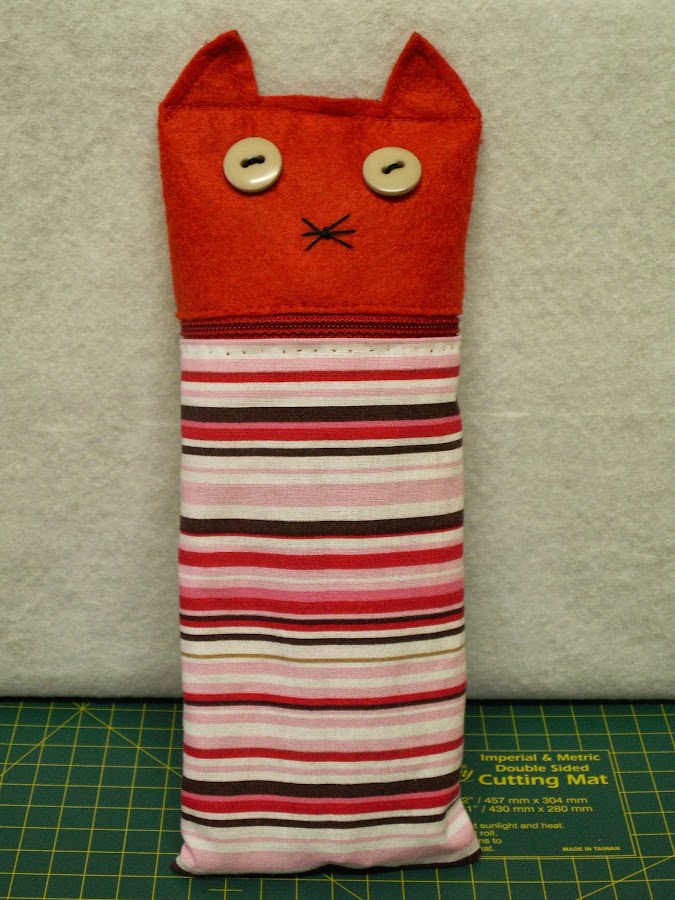 Y con uno de los trocitos de tela que me sobró del forro del primer neceser... hice este estuche para lápices o bolis!!! El cuerpo es de tela como veis y la cabeza del gato esta hecha con fieltro, con los detalles de la cara cosidos a mano.