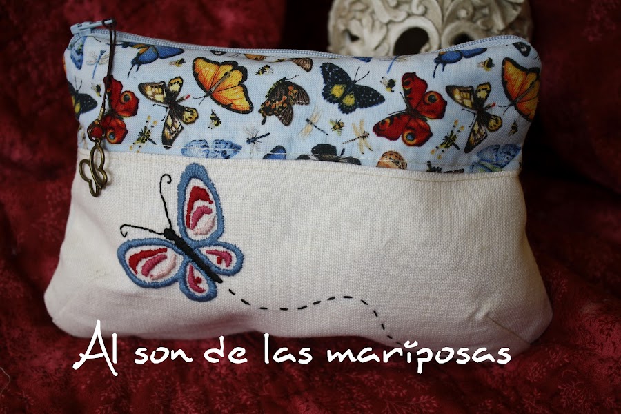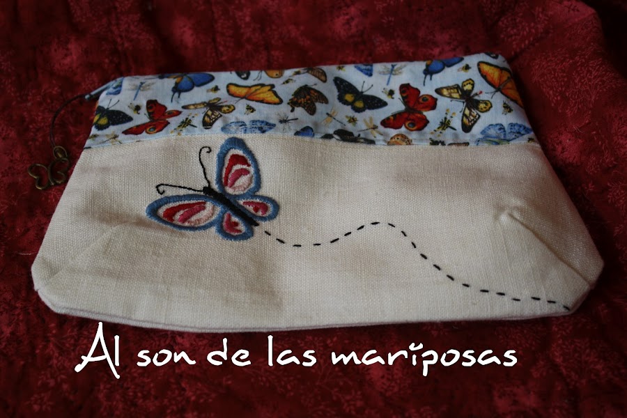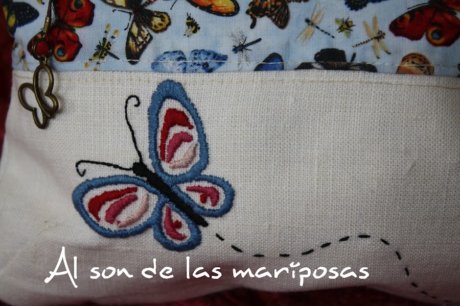 Combinación de lino rústico en color blanco roto y telas de algodón con dibujo de pequeñas mariposas.